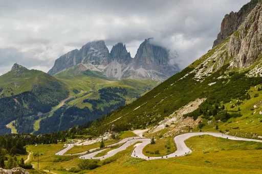 Das Bild zeigt die Südwestrampe vor der Kulisse der Rieserfernergruppe. Die Straße führt durch eine äußerst reizvolle Landschaft. Dank der Einbahnregelung war es recht kommod, entlang der Straße zu wandern und in Ruhe nach einem guten Standpunkt zu suchen. Ich hatte dann drei Motive gefunden, die ich im Laufe des Abends fotografierte. Das dritte Bild, bei dem das Licht durch die feine Wolkenschicht besonders weich wirkt, ist mein Favorit.